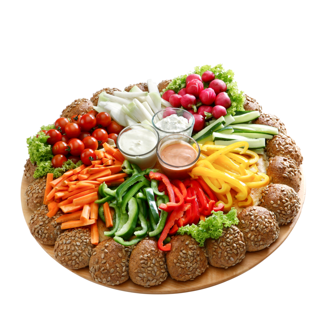 verschiedene Gemüsesticks mit dreierlei Dips und mini Vollkorn-Brötchen